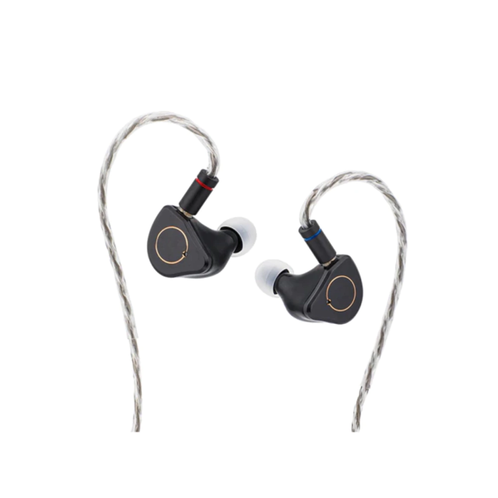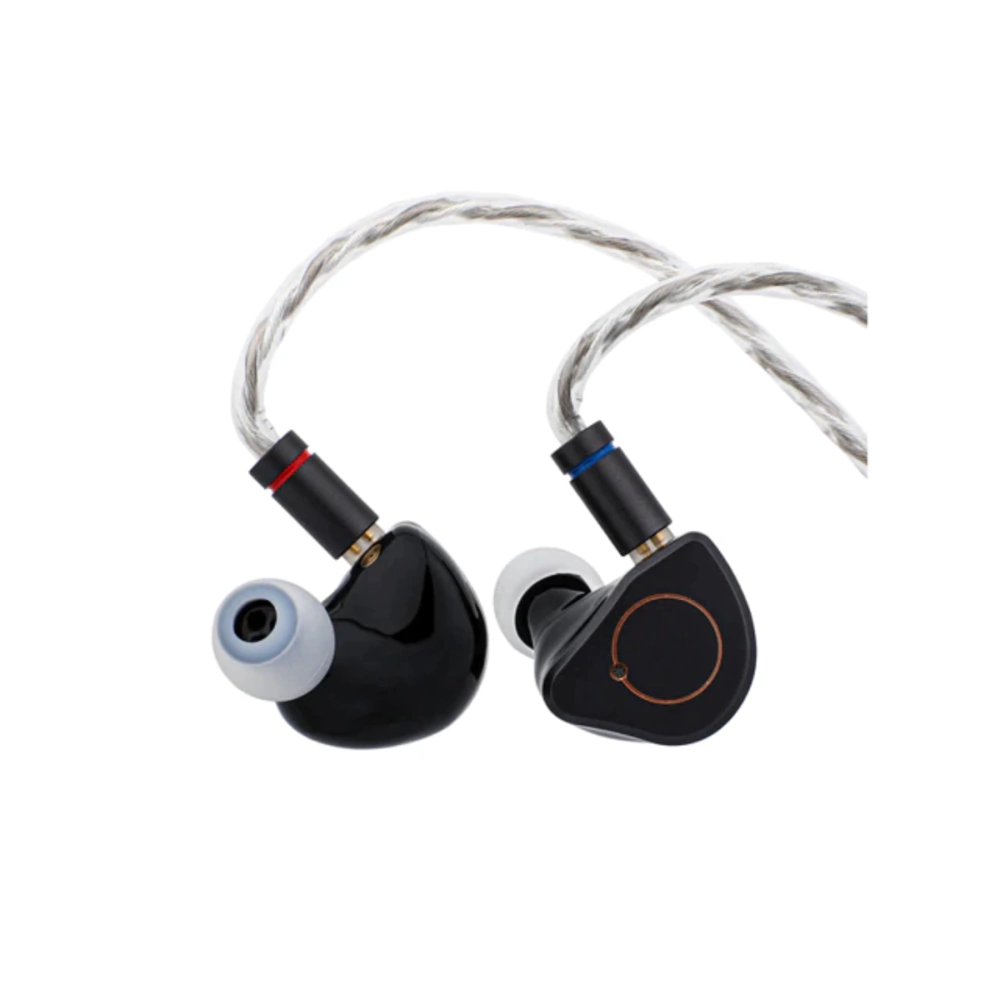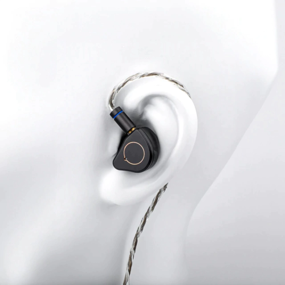 La concha de resina negra translúcida y la placa frontal de metal mate combinan elegancia y funcionalidad acústica. El diseño ergonómico basado en un mapeo 3D de la oreja garantiza un ajuste seguro y cómodo incluso en largas sesiones de uso. El cable desmontable de cobre libre de oxígeno recubierto de plata está diseñado para maximizar la claridad y la separación sonora.
